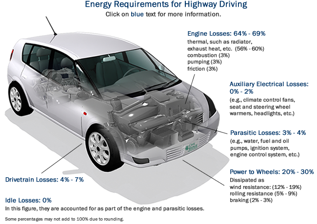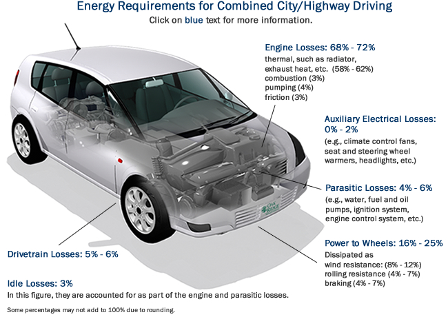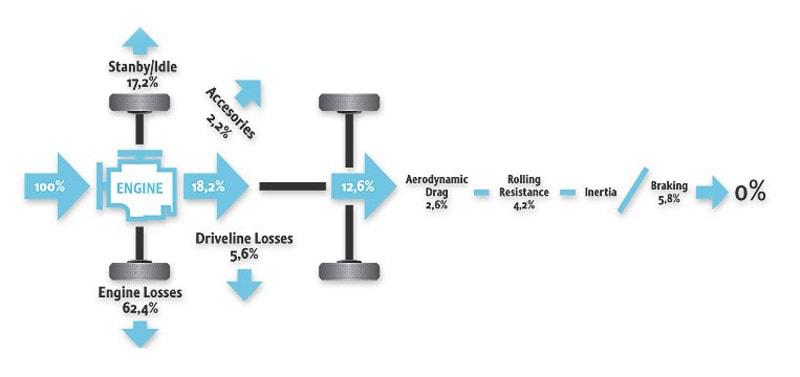 I dati riportati nelle figure seguenti, desunti dagli studi condotti dal EPA (Environment Protection Agency of USA) e negli studi del Dipartimento delle Risorse, Energie e Turismo del Governo Australiano, riassunte nel diagramma noto come Diagramma Sankey, sono significativi. Stabilita al 100% l’energia massima potenzialmente fornibile da 1 litro di carburante introdotto nel serbatoio, le sole perdite a livello del motore sono superiori al 60-70%, dipendendo dalla tipologia di strada e guida affrontata e adottata. Il mantenimento dei sistemi ausiliari e di comfort interno riescono a consumare anche il 7% dell’energia potenziale disponibile. Nei percorsi urbani, se l’auto non dispone dei sistemi start/stop, a causa dei continui rallentamenti e stop nelle code cittadine, riesce a perdere fino al 17-20% di energia. Alla fine il rendimento globale è molto basso, indicando che l’energia finale disponibile alle ruote, necessaria per la marica vera e propria, è pari a circa il 15-25% dell’energia iniziale posseduta dal carburante immesso. Rivedendo quindi i numeri in gioco, si evidenzia che il rendimento globale dell’autoveicolo, dato dall’energia effettivamente utilizzata per la conduzione del veicolo (marcia + vincita resistenze esterne aerodinamiche + sistemi ausiliari interni) è variabile tra il 25% e il 35% massimo, nei veicoli più efficienti e per tratti quasi completamente guidati (autostrada).