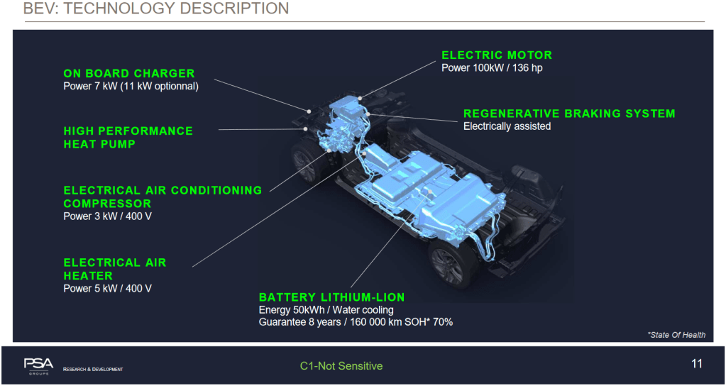 Nelle auto elettriche (Battery Electric Vehicle – BEV), e solo elettriche, naturalmente vengono utilizzati per generare il moto solo i motori elettrici, anche in questo caso due o più in base alla tipologia di trazione che vogliamo, utilizzando solo l’energia accumulata nelle batterie. Lo schema seguente (fonte: Groupe PSA) chiarisce posizione del motore, del pacco batterie e di tutto quello che interessa questa tipologia di veicoli. L’immagine è interessante perchè permette di identificare tutti i principali elementi che compongono un’auto a trazione elettrica e la loro posizione nel veicolo.