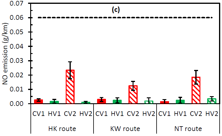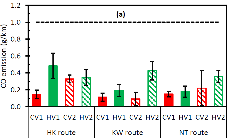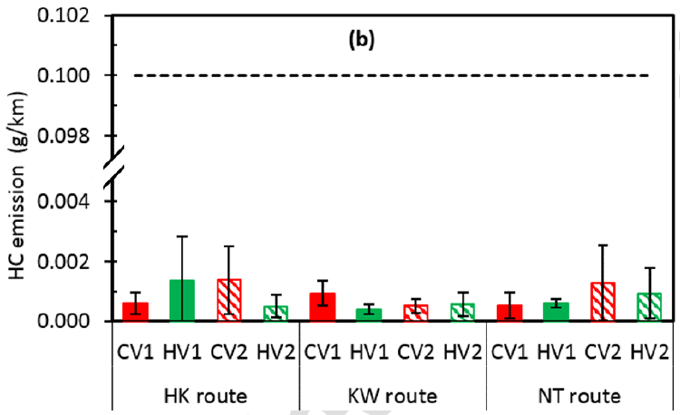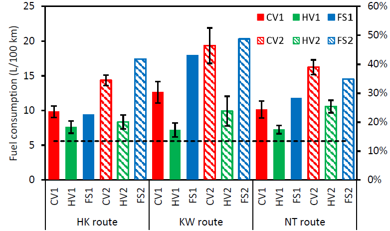 Uno studio approfondito, sempre condotto dal University of Technology Sydney, mostrano per alcune coppie di veicoli gemelli, di cui uno alimentato dal solo motore endotermico, l’altro della tipologia full hybrid, conferma la riduzione dell’inquinamento durante la marcia, anche su lunghi percorsi e su strade reali di varia natura. Le immagini precedenti mostrano i risultati relativi alla riduzione (FS) percentuale dei consumi tra 2 coppie di veicoli, tradizionali (CV) e ibridi (HV), su tre tipologie di lunghi percorsi, identificati come “HK route”, “KW route” e “NT route”. La riduzione delle emissioni inquinanti risulta dagli altri grafici proposti.